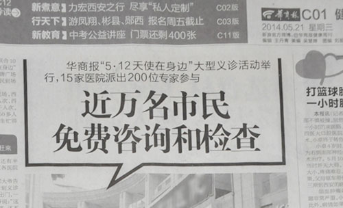【5·12天使在身边】后续报道,5月18日,由华商报社主办的“惠民健康”大雁塔汉唐广场大型义诊活动火热举行,、省医院、西安中大耳鼻喉医院等15家医院200多位医生参与,给近万名市民提供帮助。据不完全统计,西安新城中大耳鼻喉医院接诊近1000人,免费为市民做详细的耳、鼻、咽喉检查,发放爱耳体检卡等。医生们表示,虽然累,但能够为市民提供实际的帮助,作为医生很值得。
