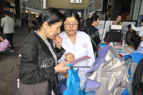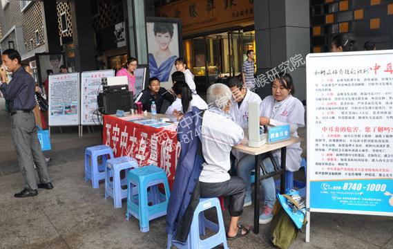 昨日,由西安市新城区卫生局牵头举办的“服务百姓健康行动”大型义诊活动在西安市解放路万达广场举行。以西安新城中大耳鼻喉医院为代表的西安市17个医疗机构的200多名医务人员走上街头,冒雨为上千名市民进行健康查体和疾病宣传。随后一周内,义诊活动将下乡镇、基层,把健康服务送到百姓家门口。