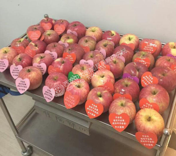 圣诞节前一天晚上,24日晚又叫平安夜,送苹果有平平安安,团团圆圆的寓意。苹果是圆的,象征着祝福人家团圆幸福的意思。苹字谐音平,即平安的意思!西安新城中大耳鼻喉医院为给患者送去平安祝福,精心挑选大批苹果,打好精美的包装。院长、病区主任和护士长亲自来助阵,把平安果亲自送到每一位患者手中,祝福每一位患者能够平平安安、早日恢复健康!