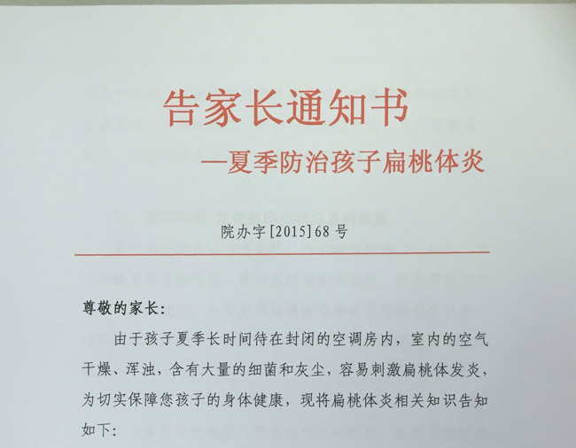 由于孩子夏季长时间待在封闭的空调房内,室内的空气干燥、浑浊,含有大量的细菌和灰尘,容易刺激扁桃体发炎,为切实保障您孩子的身体健康,现将扁桃体炎相关知识告知如下: