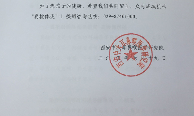 为了您孩子的健康,希望我们共同配合,众志成城抗击“扁桃体炎”!疾病咨询热线:029-87401000。