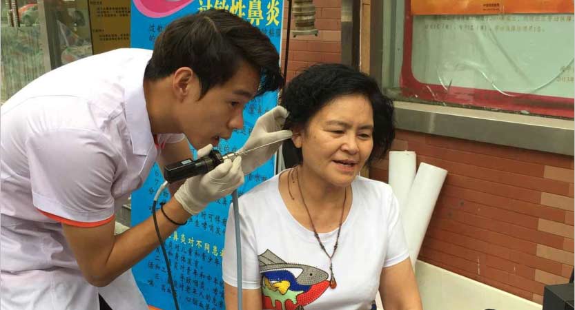 义诊活动现场:社区居民正在接受耳内窥镜检查