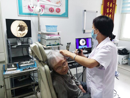 老年公寓的张奶奶正进行耳内窥镜检查