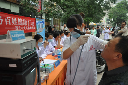 以西安新城中大耳鼻喉医院为代表的西安市17个医疗机构的200多名医务人员走上街头,为上千名市民进行健康查体和疾病宣传。
