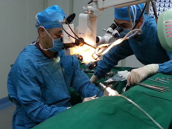 图为:西安中大张全安教授实施耳显微外科高难度手术