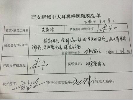 1月8日,西安新城中大耳鼻喉医院领导对吴秀玲的好人好事拾金不昧之举给予100元的奖励,以示鼓励。